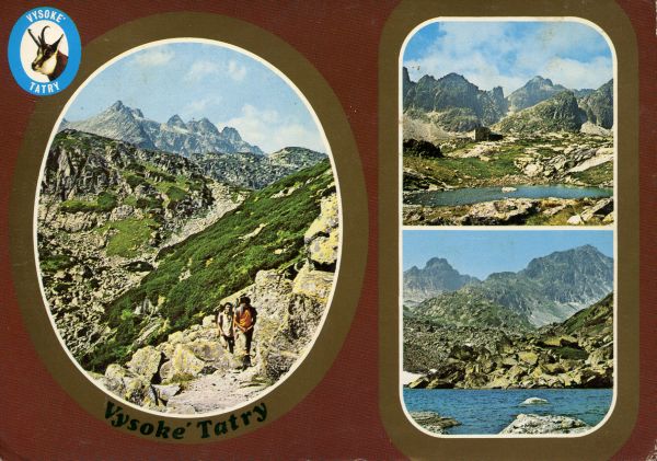 Dziką Turnię i Świstowy Szczyt nad Długim Stawem Staroleśnym w Dolinie Staroleśnej. U góry po lewej stronie głowa kozicy otoczona napisem: VYSOKÉ TATRY, na dole po lewej stronie napis: Vysoké Tatry.