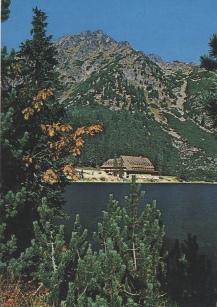 Tatry Wysokie. Popradzki Staw z hotelem górskim na północnym brzegu jeziora. Tytuł również w języku