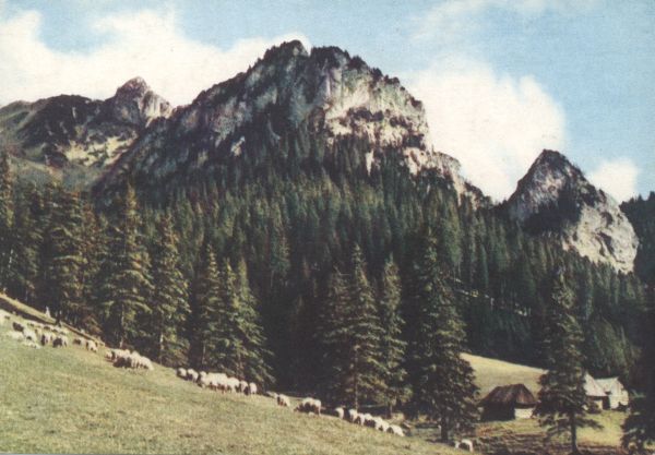 Widok na Halę Pisaną oraz wznoszący się nad nią Ratusz i Saturn. Na polanie przy szałasach pasą się owce. Pejzaż letni. Fotografia barwna.