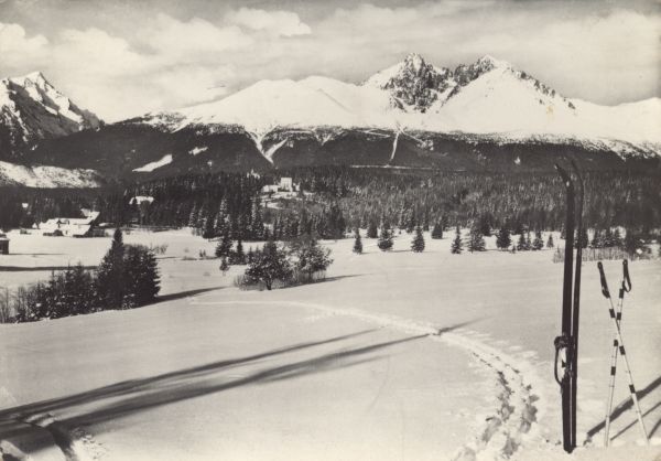 Zimowy widok z Tatrzańskiej Łomnicy. Na pierwszym planie po prawej stronie narty i kijki narciarskie wbite w ¶nieg. W głębi las oraz budynki mieszkalne. W tle: Sławkowski Szczyt, Łomnicka Grań, Łomnicka Przełęcz, Łomnica, Kieżmarski Szczyt, Huncowski Szczyt i Rakuska Czuba.
