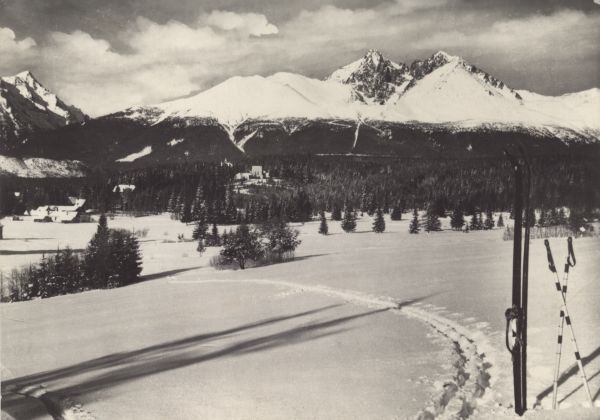 Zimowy widok z Tatrzańskiej Łomnicy. Na pierwszym planie po prawej stronie narty i kijki narciarskie wbite w ¶nieg. W głębi las oraz budynki mieszkalne. W tle: Sławkowski Szczyt, Łomnicka Grań, Łomnicka Przełęcz, Łomnica, Kieżmarski Szczyt, Huncowski Szczyt i Rakuska Czuba.
