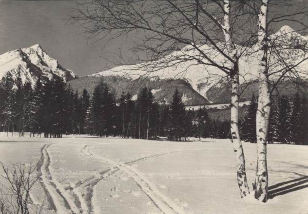 Widok z Tatrzańskiej Łomnicy w scenerii zimowej. Na pierwszym planie po prawej stronie drzewo, w głêbi las. W tle Sławkowski Szczyt i Łomnica.