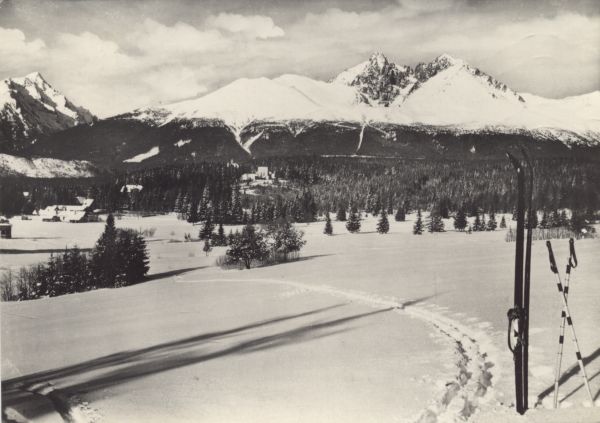 Zimowy widok z Tatrzańskiej Łomnicy. Na pierwszym planie po prawej stronie narty i kijki narciarskie wbite w ¶nieg. W głębi las oraz budynki mieszkalne. W tle: Sławkowski Szczyt, Łomnicka Grań, Łomnicka Przełęcz, Łomnica, Kieżmarski Szczyt, Huncowski Szczyt i Rakuska Czuba.