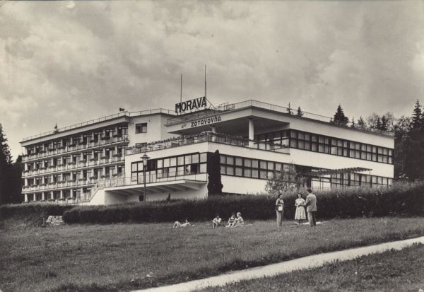 Budynek związkowego domu wypoczynkowego Morawa w Tatrzańskiej Łomnicy i jego otoczenie. Na pierwszym planie wypoczywający wczasowicze.