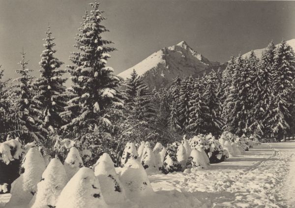 Widok na Sławkowski Szczyt. Na pierwszym planie o¶nieżone drzewa i droga.