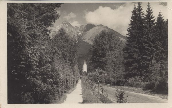Widok z Tatrzańskiej Łomnicy na Łomnicę i Kieżmarski Szczyt. Poniżej stacja kolei linowej nad Łomnickim Stawem. Na pierwszym planie kościół ewangelicki i droga.