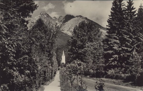 Widok z Tatrzańskiej Łomnicy na Łomnicę, Widły i Kieżmarski Szczyt. Na pierwszym planie kościół ewangelicki, droga i chodnik.