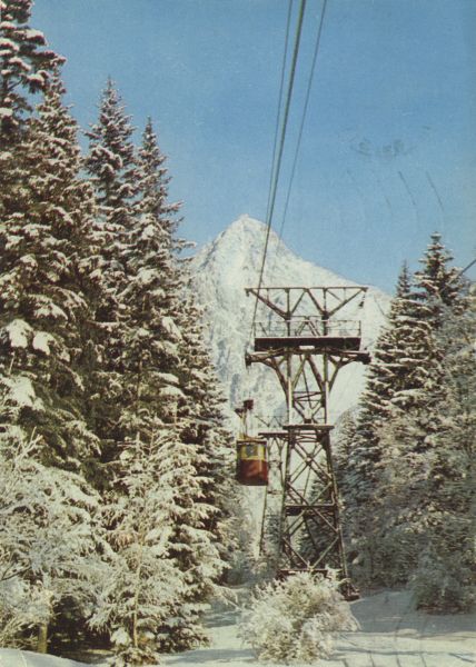 Tatry Wysokie. Kolej linowa do Łomnickiego Stawu. W tle Łomnica. Tytuł również w języku: ros., niem, ang.