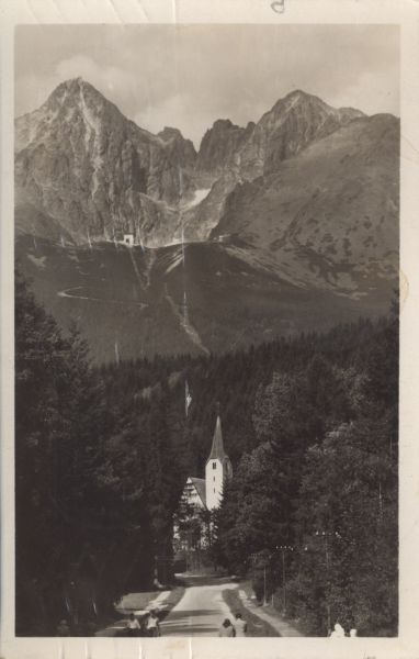 Widok z Tatrzańskiej Łomnicy na Łomnicę i Kieżmarski Szczyt. Poniżej stacja kolei linowej nad Łomnickim Stawem. Na pierwszym planie kościół ewangelicki, droga i idący po niej ludzie.