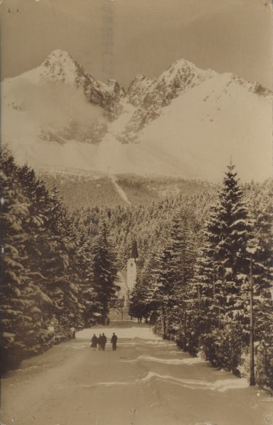 Widok z Tatrzańskiej Łomnicy na Łomnicę i Kieżmarski Szczyt w zimie. Poniżej stacja kolei linowej nad Łomnickim Stawem. Na pierwszym planie kościół ewangelicki, droga i idący po niej ludzie.