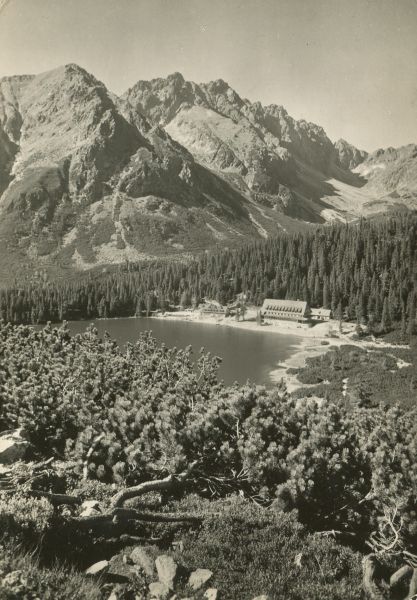 Widok na Popradzki Staw. Na pierwszym planie kosodrzewina (Pinus mugo Turra). W głębi hotel górski kpt. Štefana Morávki otoczony lasem. W tle Mała Baszta, Pośrednia Baszta oraz Szatan.