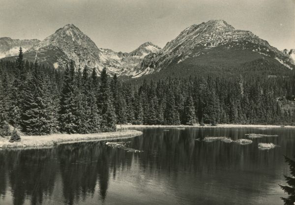 Widok Szczyrbskiego Jeziora z odbijaj±cymi się wodzie szczytami. Od lewej widoczne: Szczyrbskie Solisko, Szczyrbski Szczyt, Skrajna Baszta.