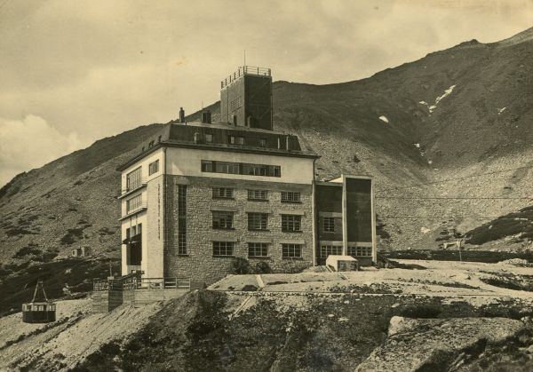 Widok na budynek stacji kolei linowej oraz hotel Encián (Gencjana) nad Łomnickim Stawem.