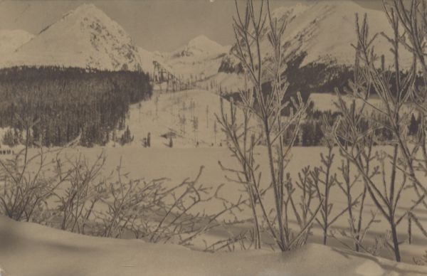 Zimowy widok znad skutego lodem Szczyrbskiego Jeziora na Wielkie Solisko, Szczyrbski Szczyt i Skrajn± Basztę. Pod Skrajnym Soliskiem widoczna skocznia narciarska. Na pierwszym planie oszronione gałęzie drzew.