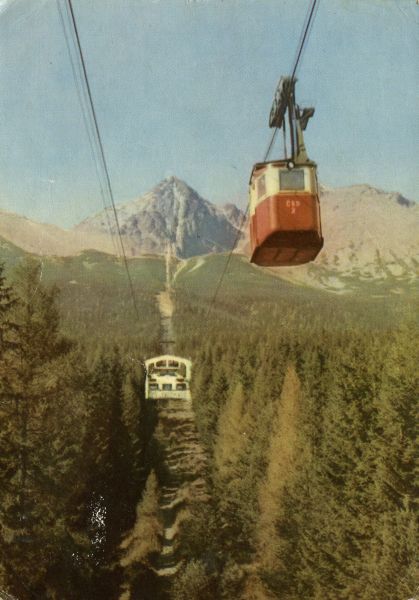Tatrzański Park Narodowy [Słowacja]. Kolej linowa z Tatrzańskiej Łomnicy na Łomnicki Staw. W tle Łomnica. Tytuł również w języku: ros., niem., ang.