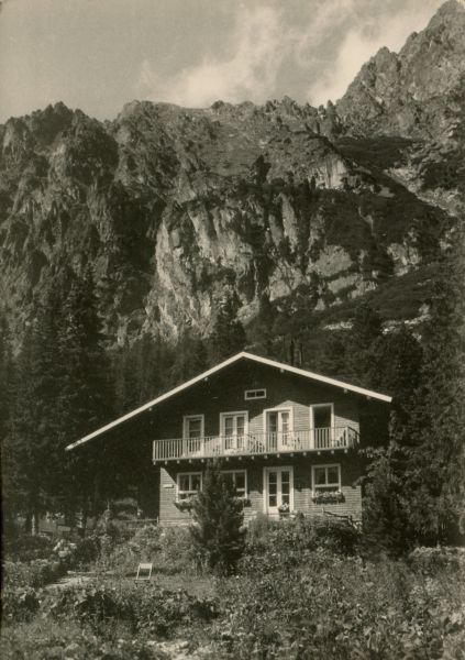 Widok na schronisko Zamkowskiego (okresowo kpt. Nalepki) w Dolinie Małej Zimnej Wody. W tle Łomnicka Grań.