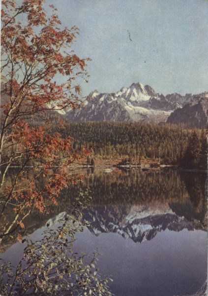 Tatrzański Park Narodowy [Słowacja]. Szczyrbskie Jezioro w tle Wysoka. Tytuł również w języku: ros., ang., niem.
