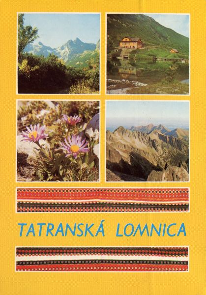 Pocztówka 4 elementowa. Widok z Doliny Białej Wody Kieżmarskiej na Czarny Szczyt (z lewej), Czarna Przełęcz nad Dolina Jastrzębi±. Mały Kołowy Szczyt, Kołowy Szczyt i Dolina Jagnięca. Dolina Zielona Kieżmarska. Zielony Staw Kieżmarski. Schronisko nad Zielonym Stawem. Ro¶lina tatrzańska. Panorama Tatr Bielskich i północnej czę¶ci Tatr Wysokich z Łomnicy. Napis: TATRANSKÁ LOMNICA.