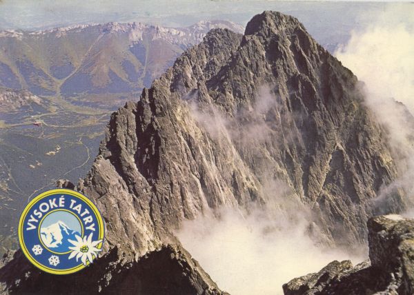 Widok z Łomnicy na Grań Wideł, Kieżmarski Szczyt i Mały Kieżmarski Szczyt. W tle Tatry Bielskie. W lewym dolnym rogu logo miasta VYSOKÉ TATRY.