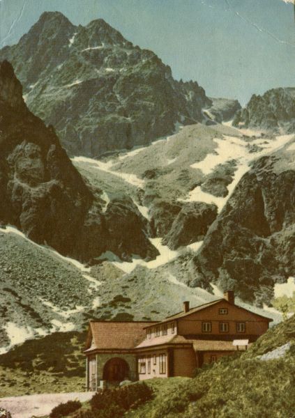 Tatry Wysokie. Schronisko Brnèala w Dolinie Zielonego Stawu Kieżmarskiego. Od lewej: Durny Szczyt i Pyszny Szczyt. Tytuł również w jêzyku: ros., ang., niem.