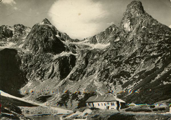 Widok na Zielony Staw Kieżmarski i jego otoczenie. Nad stawem schronisko turystyczne. W tle Baranie Rogi, Czarny Szczyt, Kołowy Szczyt i Jastrzębia Turnia.