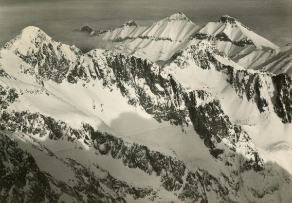 Tatry Wysokie - widok z Łomnicy na Tatry Bielskie. Na przodzie Kołowy Szczyt. Tytuł również w języku: ros., niem., ang.