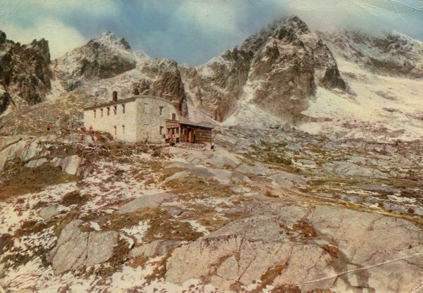 Tatrzański Park Narodowy [Słowacja] - Dolina Małej Zimnej Wody, Schronisko Téryego. Od lewej Sp±ga, Mały Lodowy Szczyt i Lodowa Kopa. Tytuł również w jêzyku: ros., ang., niem.