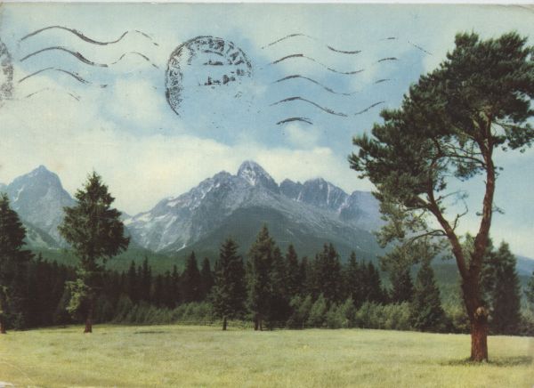 Widok na Tatry Wysokie z południa. Od lewej: Po¶rednia Grań, Łomnica, Grań Wideł i Kieżmarski Szczyt. Na pierwszym planie polana z lasem w tle. U góry odbity stempel.