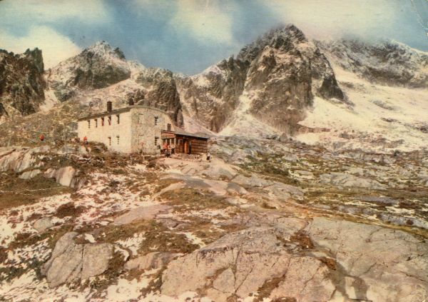 Tatrzański Park Narodowy [Słowacja] - Dolina Małej Zimnej Wody, Schronisko Téryego. Od lewej Sp±ga, Mały Lodowy Szczyt i Lodowa Kopa. Tytuł również w jêzyku: ros., ang., niem.