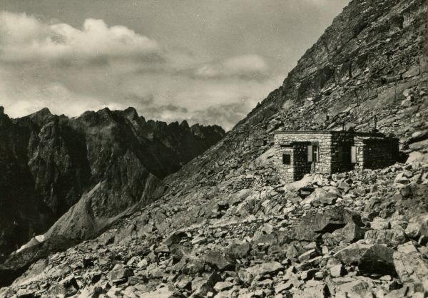 Schronisko pod Rysami. W tle widoczna grań Baszt nad Doliną Mięguszowiecką. Z tyłu Krywań.