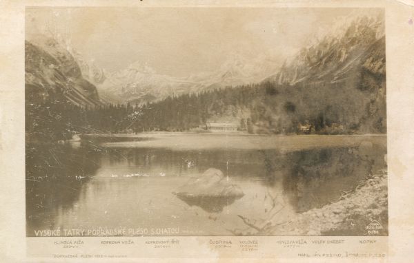 Popradzki Staw ze schroniskiem. W tle Hlińska Turnia, Mała Koprowa Turnia, Koprowy Wierch, Cubryna, Wołowiec Mięguszowiecki, Hińczowa Turnia, Wołowy Grzbiet, Kopa Popradzka. Na dole tytuł i znak producenta, pod zdjęciem nazwy i wysokości szczytów oraz nakładca.
