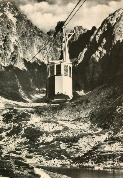 Wagonik kolei linowej nad Dolin± Łomnick±. W dole Łomnicki Staw. W tle Łomnica i Kieżmarski Szczyt.