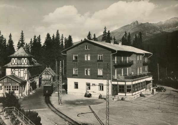 Widok na budynek sanatorium dla dzieci w Szczyrbskim Jeziorze Solisko i jego otoczenie. Przed budynkiem na ławkach siedz± ludzie. Z lewej strony widoczna stacja Tatrzańskiej Kolei Elektrycznej, obok niej wagonik kolei. W tle Krywań i Ostra.
