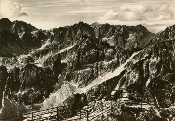 Widok z Łomnicy na zachód: na horyzoncie Gerlach, Wysoka, Krywań i Rysy. Po prawej Lodowa Kopa, na wprost Mały Lodowy Szczyt nad Dolin± Małej Zimnej Wody. Na szczycie Łomnicy widoczna platforma widokowa.