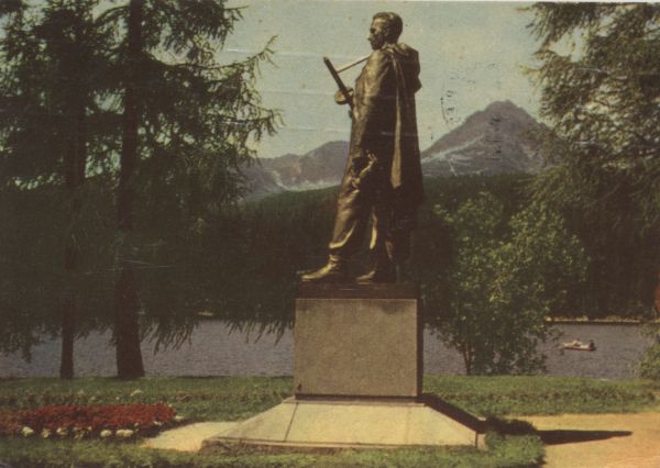 Pomnik upamiętniający Słowackie Powstanie Narodowe w latach 1944-1945. Na pierwszym planie skwer i pomnik powstańca. W tle Szczyrbskie Jezioro i otaczające go szczyty.