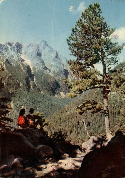 Widok na Sławkowski Szczyt z Magistrali Tatrzańskiej. Na pierwszym planie 2 turystów i limba (Pinus cembra L.).