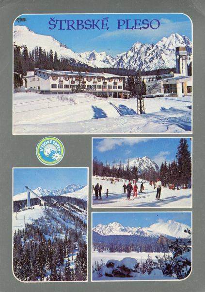 Pocztówka 5. elementowa. Dom towarowy Prior. O¶rodek narciarski w Dolinie Młynickiej. Kompleks sportowy. Hotel Patria przy Szczyrbskim Jeziorze. Dodatkowo logo miasta Vysoké Tatry i napis: ©trbské Pleso.