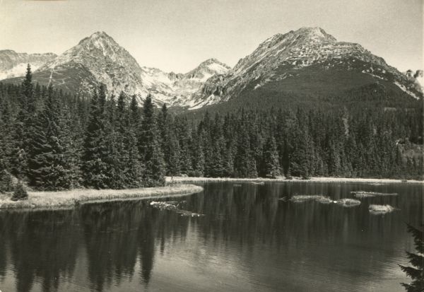 Widok Szczyrbskiego Jeziora z odbijaj±cymi się wodzie szczytami. Od lewej widoczne: Szczyrbskie Solisko, Szczyrbski Szczyt i Skrajna Baszta.