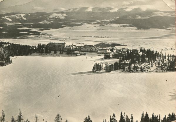 Zimowy widok na skute lodem Szczyrbskie Jezioro otoczone lasem i zabudowania hotelowo sanatoryjne na jego brzegu. W tle Kotlina Liptowska i Niżne Tatry.