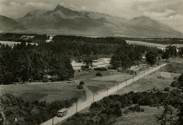 Widok na Dolinę Bielskiego Potoku. Na pierwszym planie droga i poruszający się po niej autobus. Widoczny Bielski Potok i jego otoczenie. W tle Tatry Bielskie.
