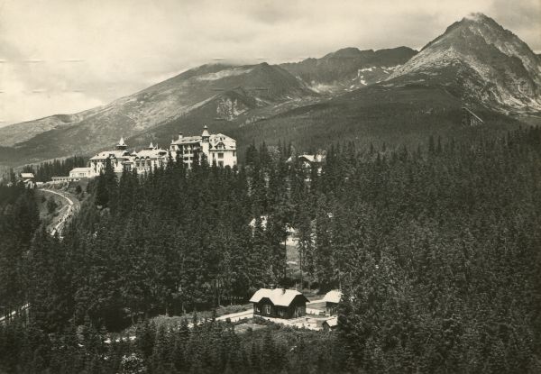 Widok na osadę Szczyrbskie Jezioro i jej otoczenie. W dali zabudowania sanatoryjne. W tle szczyty: Krywań, Ostra i Wielkie Solisko.