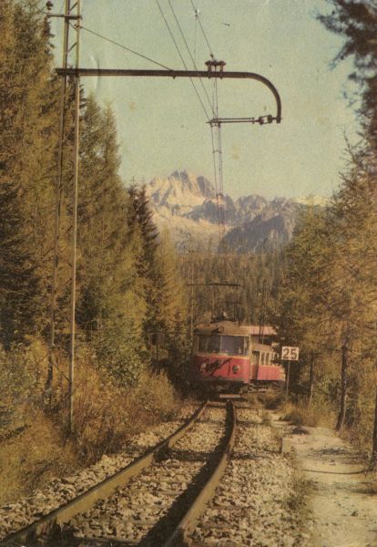 Tatrzański Park Narodowy [Słowacja]. Tatrzańska Kolej Elektryczna do Szczyrbskiego Jeziora. W tle Wysoka. Tytuł również w jêzyku: ros., ang., niem.