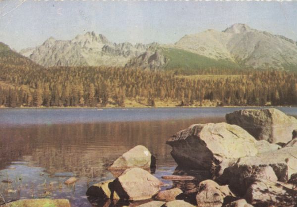 Widok znad Szczyrbskiego Jeziora na Wysok±. Po lewej Kopa Popradzka, po prawej, z przodu Osterwa. Na pierwszym planie na brzegu jeziora głazy, w tle las.