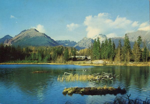 VYSOKÉ TATRY WYSOKIE TATRY - HOHE TATRA - THE HIGH TATRAS Pohľad od Nového Štrbského plesa (1315 m) na masív Soliska (vľavo) a Vysokú (2560 m, vpravo)