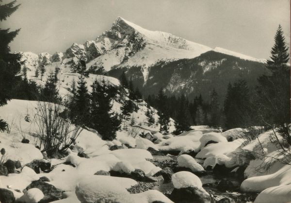 Widok na Krywań z Doliny Koprowej w zimowej scenerii. U dołu potok Koprowa Woda.