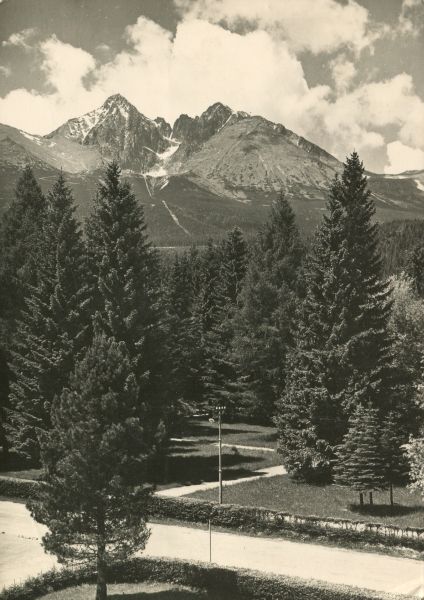 Widok na park w Tatrzańskiej Łomnicy. W tle Łomnica i Kieżmarski Szczyt.