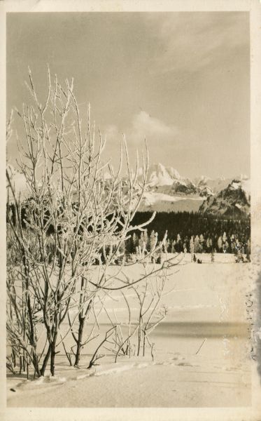 Widok na zamarznięte i zasypane ¶niegiem Szczyrbskie Jezioro. W tle szczyt Wysokiej. Na pierwszym planie krzak pokryty szadzi±.