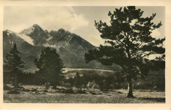 Widok na Łomnicę z Tatrzańskiej Łomnicy. Na pierwszym drzewa.