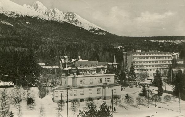 Widok na osadę Nowy Smokowiec w zimie. Widoczne zabudowania domy wypoczynkowe i sanatoria. W tle las i grupa Łomnicy.