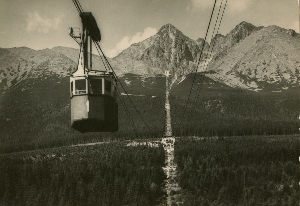 Tatry Wysokie - kolej linowa na Łomnicę pod nią kotlina Łomnickiego Stawu. [Błędny opis, wagonik kolei linowej znajduje się nad Wielkim Lasem na południe od Tatrzańskiej Łomnicy]